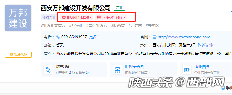 据企查查数据显示,西安万邦建设开发有限公司目前自身风险122条,涉及司法案件88个,单位及法定代表人夏琪已于2020年9月被西安市灞桥区人民法院列入限制高消名单。