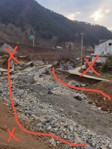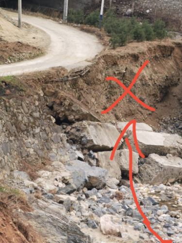 位于G70高速公路蓝田县葛牌镇,南沟隧道口,高速公路修建通车后我村建设乡道一直受自然灾害侵害,由于高速公路建设,水流加速弯道太急每逢雨季,河道水涨,洪水对村道毁坏,村民房屋受到威胁,长期无法居住。