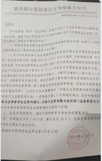 我2019年5月通过摇号购买了一套商品房,监管银行为上海浦发银行,贷款银行为昆仑银行,根据2018年9月21日发布的《关于加强商品房预售资金监督管理有关问题的通知》,明确要求所有首付款、按揭贷款必须全额存入监管账户,只能用于本项目建设。但是,经查,我的贷款根本没打入监管账户,而是直接打入了开发商的一般账户,导致购房款被挪作他用,现在工地无钱恢复全面施工,每天都只有一少部分人在工地缓慢施工,进度完全达不到如期交付的目标。我的购房款并没有用于项目建设,监管部门监管了寂寞,出了问题后,我也像区住建局、市住建局、陕西省银保监会反映了问题,然而,部门之间相互踢皮球,没有一个部门愿意承担责任,请问我到底应该找谁???