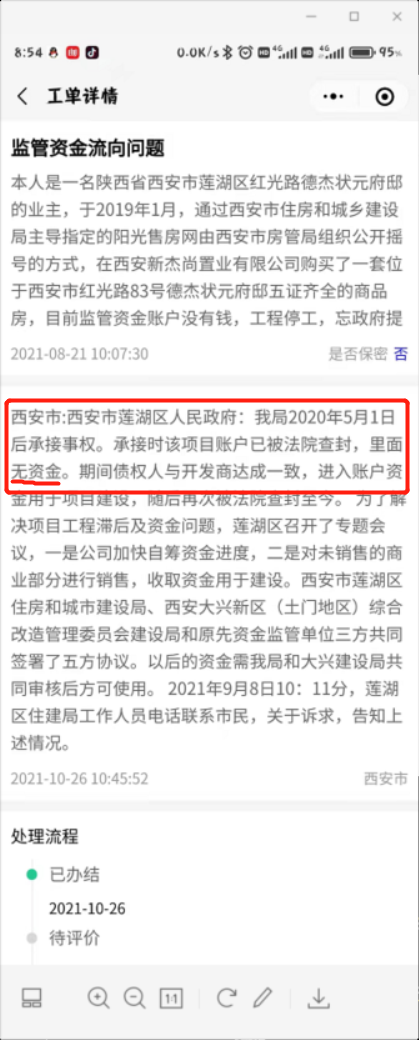 记者调查:蒲女士已向住建部门进行了反映,区住建部门已经明确告知,2020年5月该项目监管账户为零。大兴新区管委会和开发商明确表示,该项目目前没有钱进行施工,目前开发商正在想办法回笼资金。