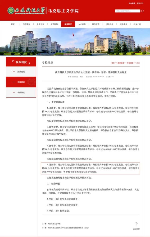 据该校马克思主义学院2017年4月发布的《西安科技大学研究生学位论文开题、预答辩、评审、答辩费用发放规定》,对于“经费来源”,明确表示:由学校负责送审的博士、硕士学位论文评审费从研究生院负责的研究生培养管理费中支出。其它开题、预答辩、评审和答辩费可从下列经费中支出:1. 学院(部)研究生培养管理费;2. 学院(部)研究生培养业务费;3. 学院(部)福奖基金。