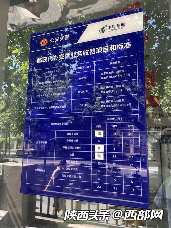 随后,西部网·陕西头条记者走访了中国邮政西安市电子城营业所。该所作为西安市率先试点警邮合作业务的网点,曾多次被公安交警、邮政和公众观摩调研。在该网点的玻璃橱窗上,张贴着《邮政代办交管业务收费项目和标准》。号牌制作费和寄递费分别由交警部门和邮政企业收取。