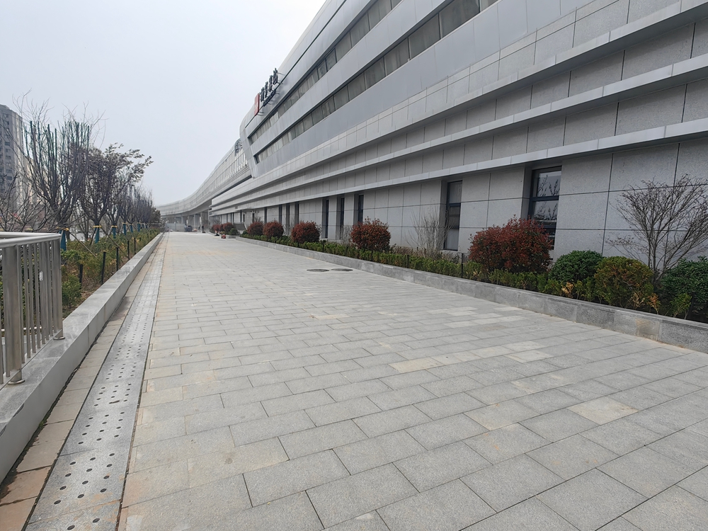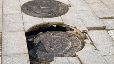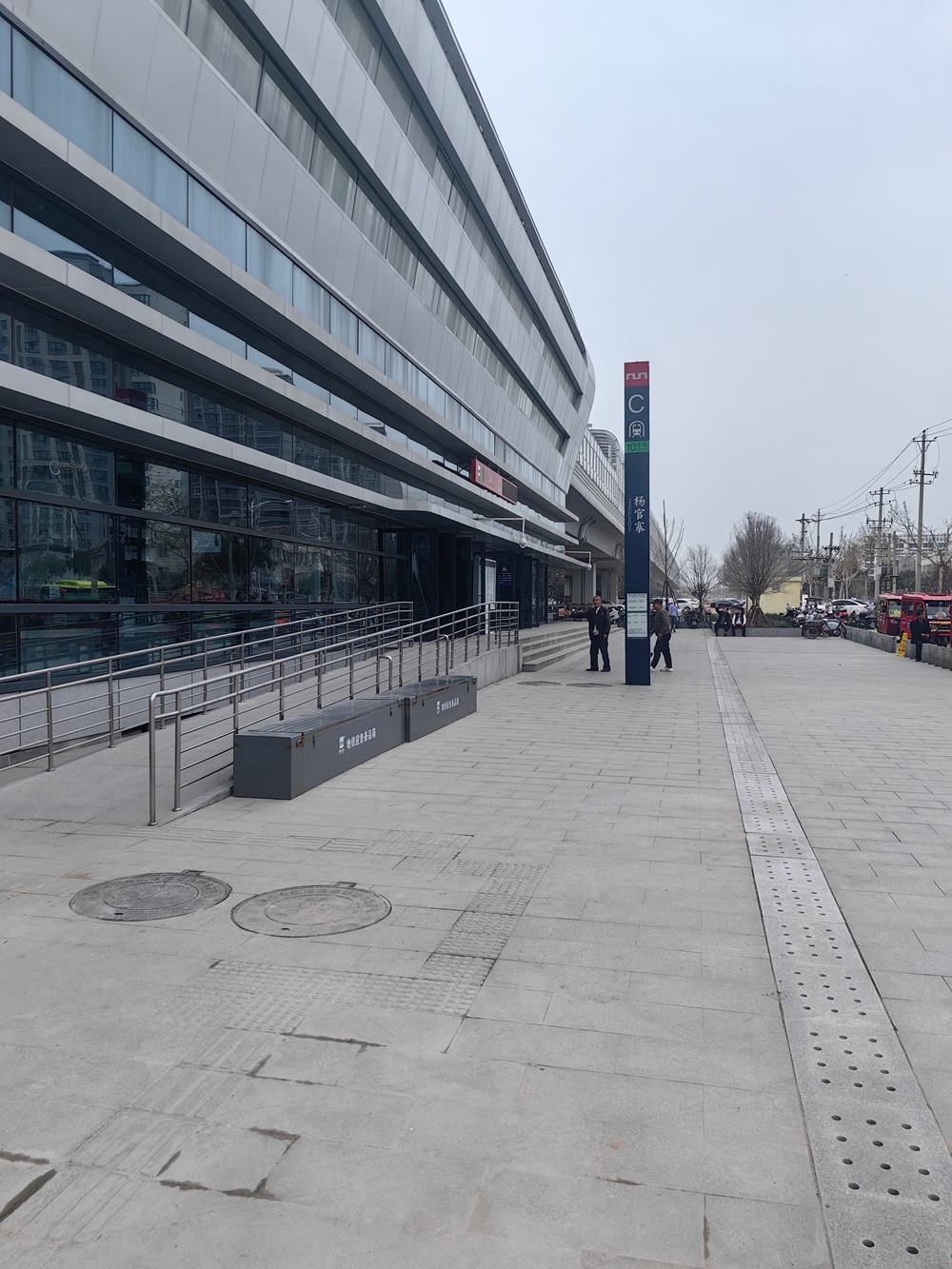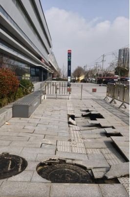另一处围挡紧邻C出口,路面塌陷较为严重,不少地砖已经掉落,透过砖块可以明显看到下面的土方和空隙,其中一个井盖下沉约10公分左右。