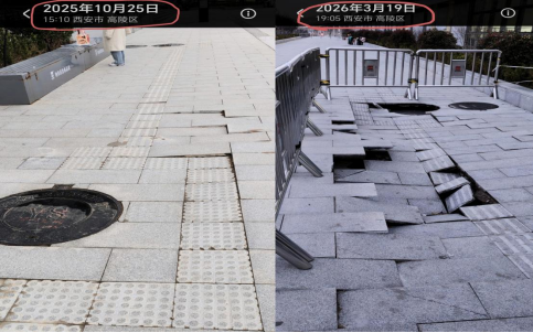 “路面从轻微凹陷到井盖错位、砖块掉落,一开始围了警戒线,最后换成了铁栅栏,但始终不见修复施工。”日前,西安市民刘先生向西部网民生热线反映,西安地铁10号线杨官寨站C口附近路面多处塌陷且越来越严重,看起来十分危险。