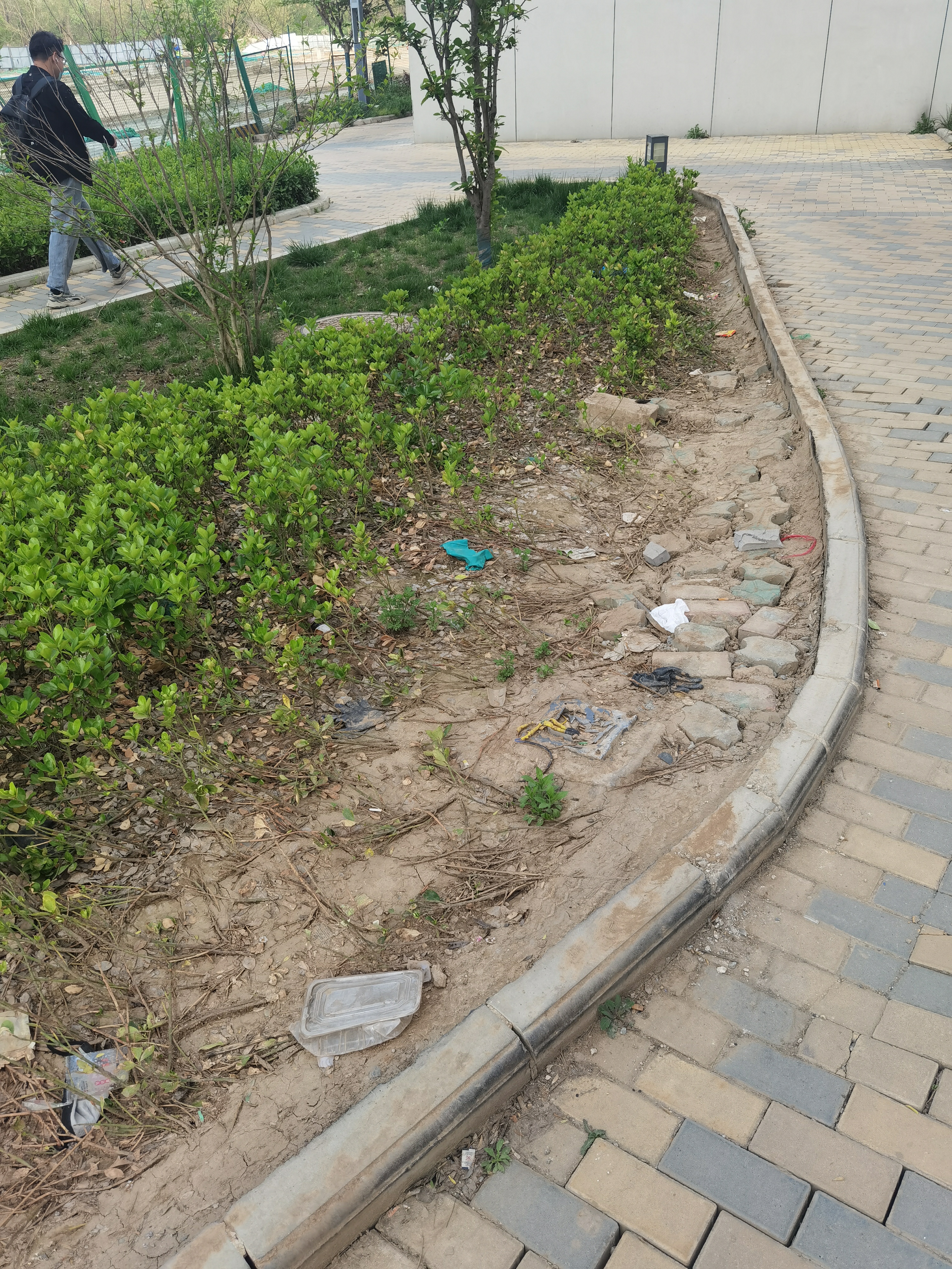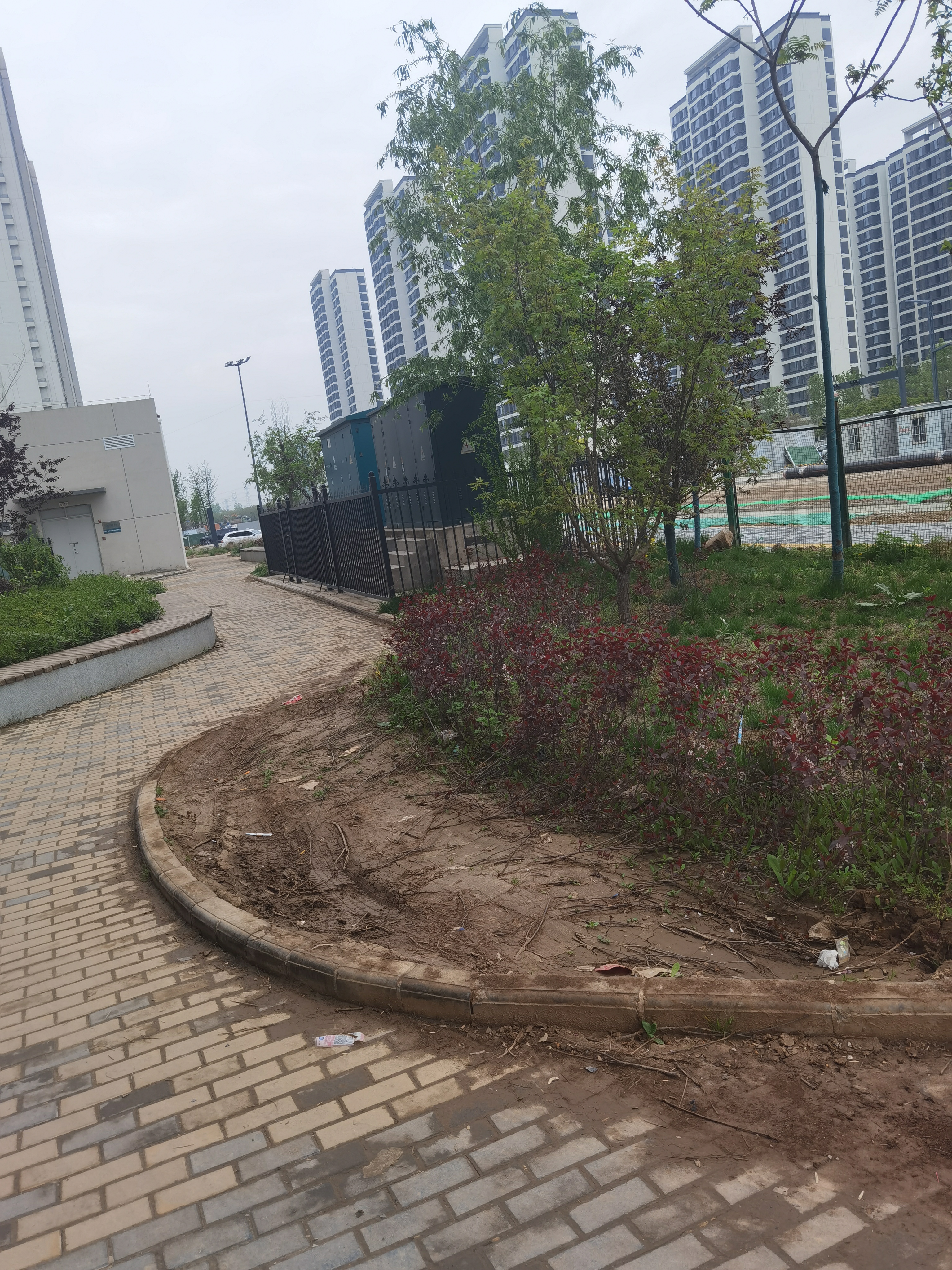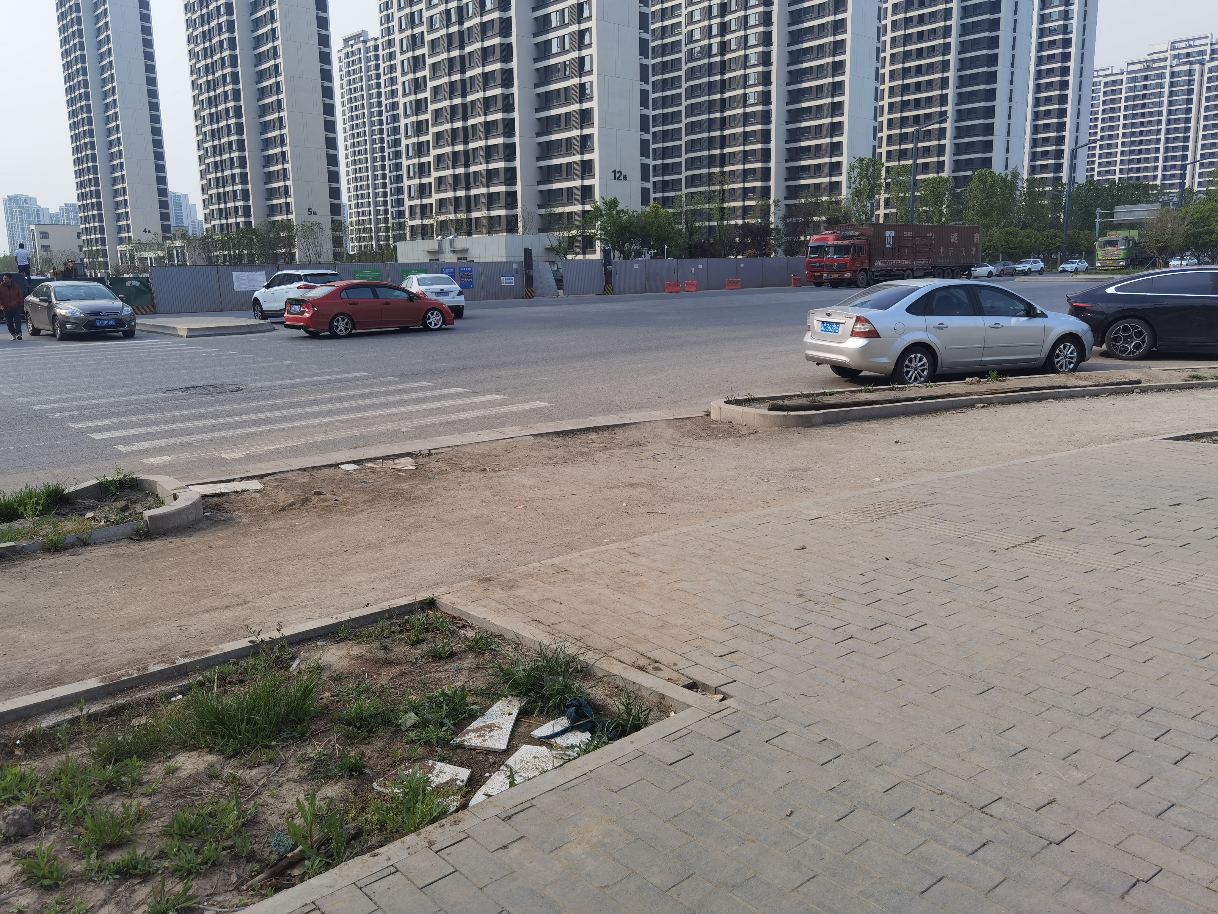 2.小区东侧创智二路通车,但南北十字路口非机动车道未铺设完成,路口绿化带区域没有栽种任何树木或者绿植;